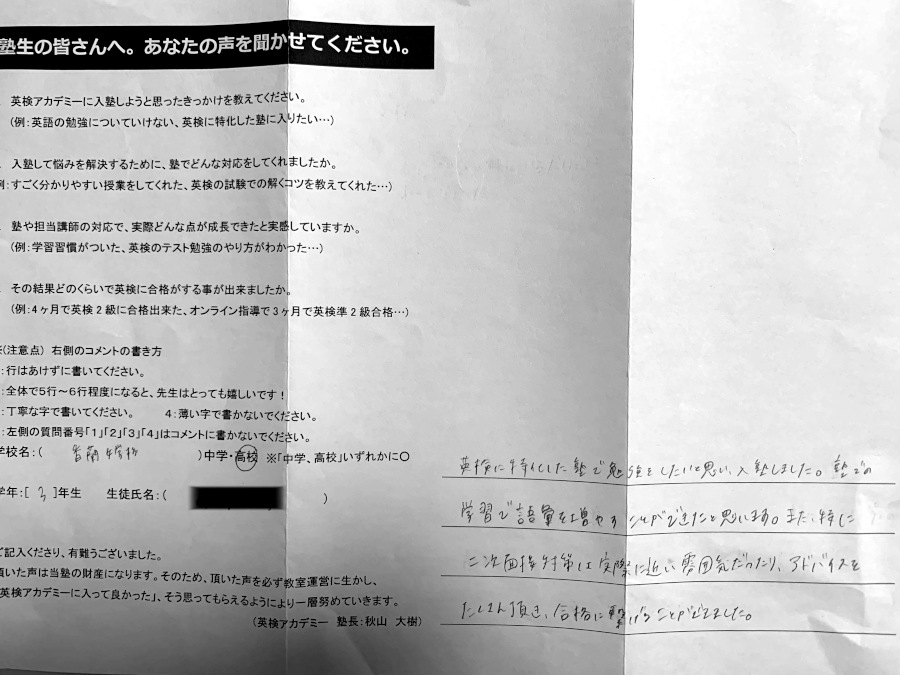 下記は英検2級に合格された生徒さんからのアンケート回答です。