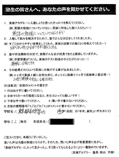英検アカデミー受講生からのアンケート回答です。