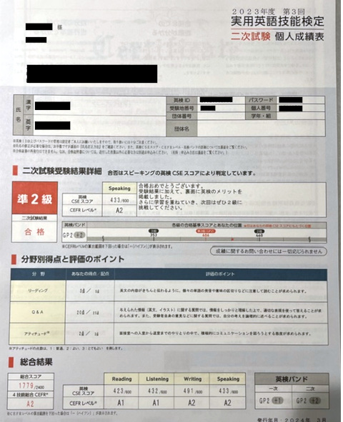 H君の保護者から、英検準2級の合格のお知らせが来ていますので、転送いたします。よろしくお願いいたします。