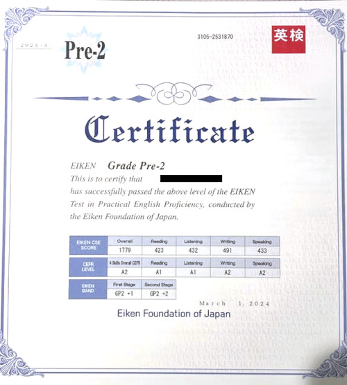 無事に準2級に受かることができ、昨日、合格証も自宅に届きました。先生のお力添えのおかげです。