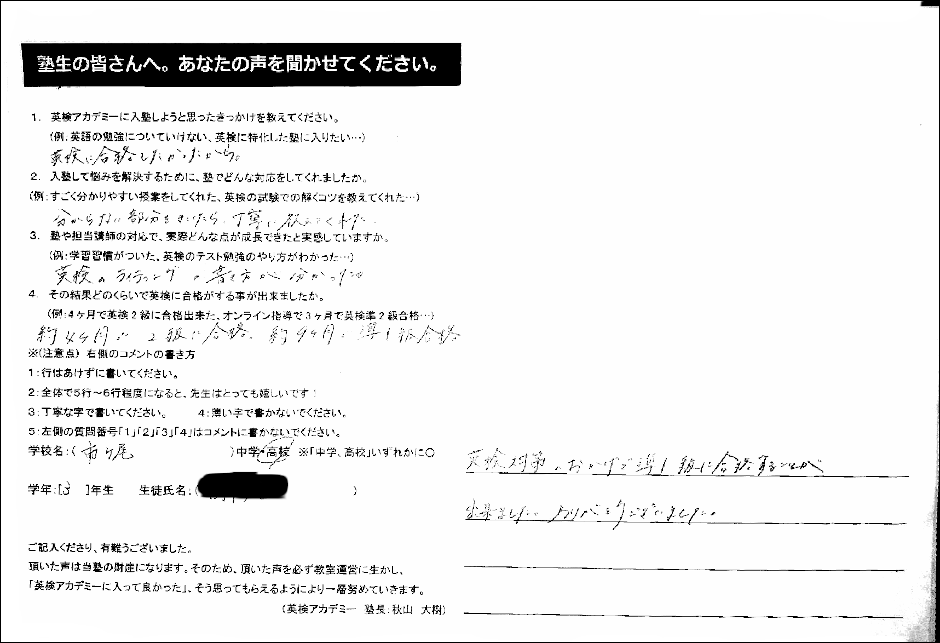 「(英検アカデミーで)英検対策して、英検準1級に合格出来ました