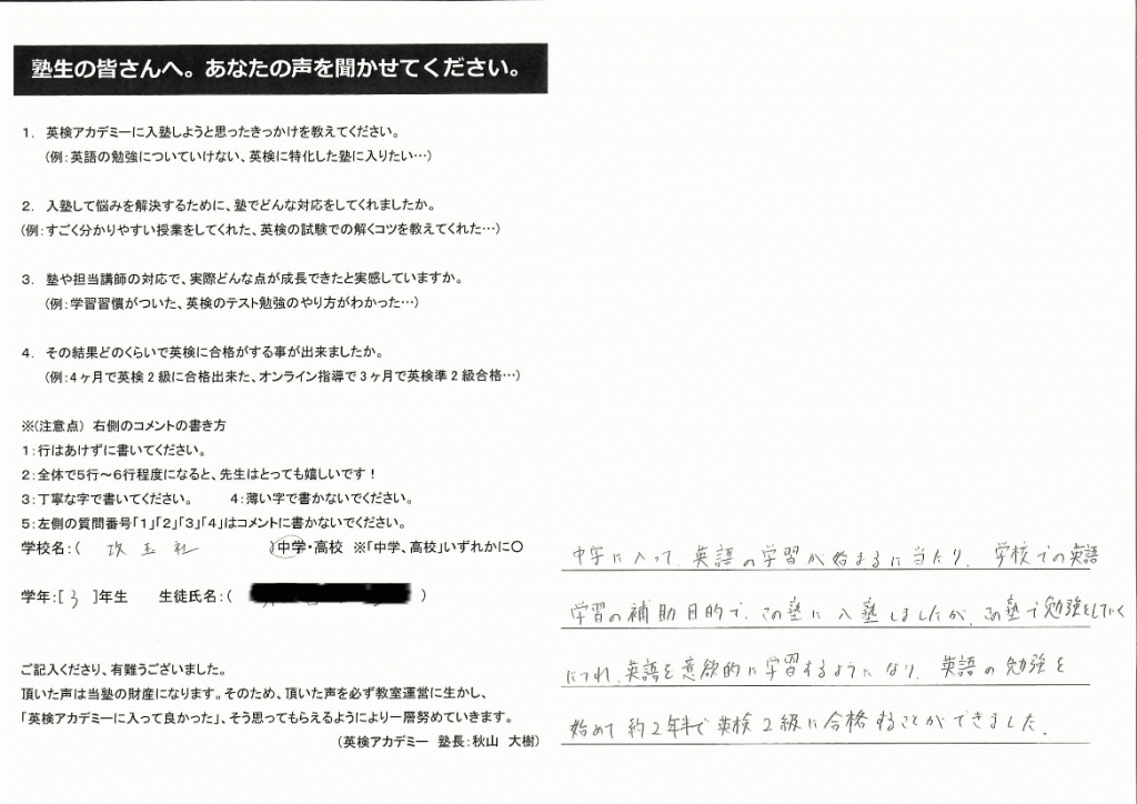 英語学習に意欲的になって、英検をどんどん受けて合格され中学3年で2級合格されました。